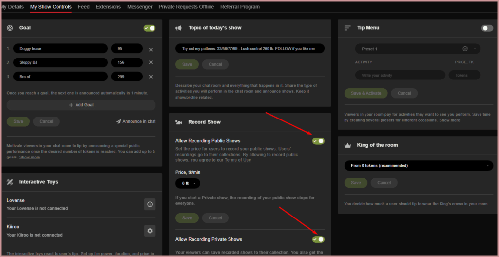This video chat room has one interesting feature. On the broadcast page, you can allow recording of private shows. This will allow customers to save private broadcasts in their personal account, as well as add them to their own album. Whether it will be available to registered users, all or only friends, decide for yourself: