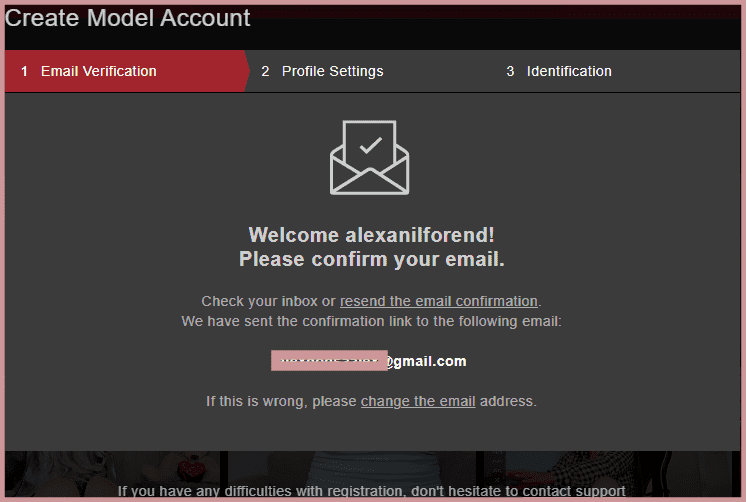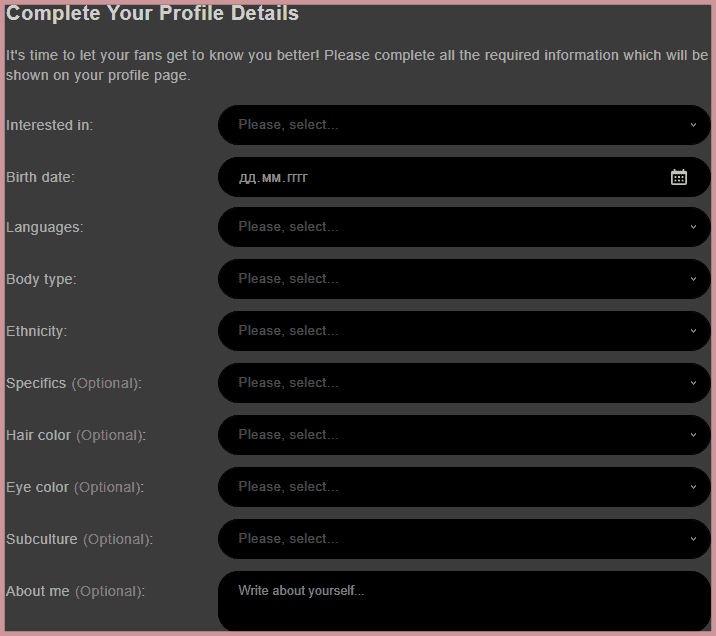 In the second step of registration, the model tells about herself. This data will be displayed in the profile (publicly available). It is possible to specify not the real country, city, date of birth. You also must describe your physique and specify other information: