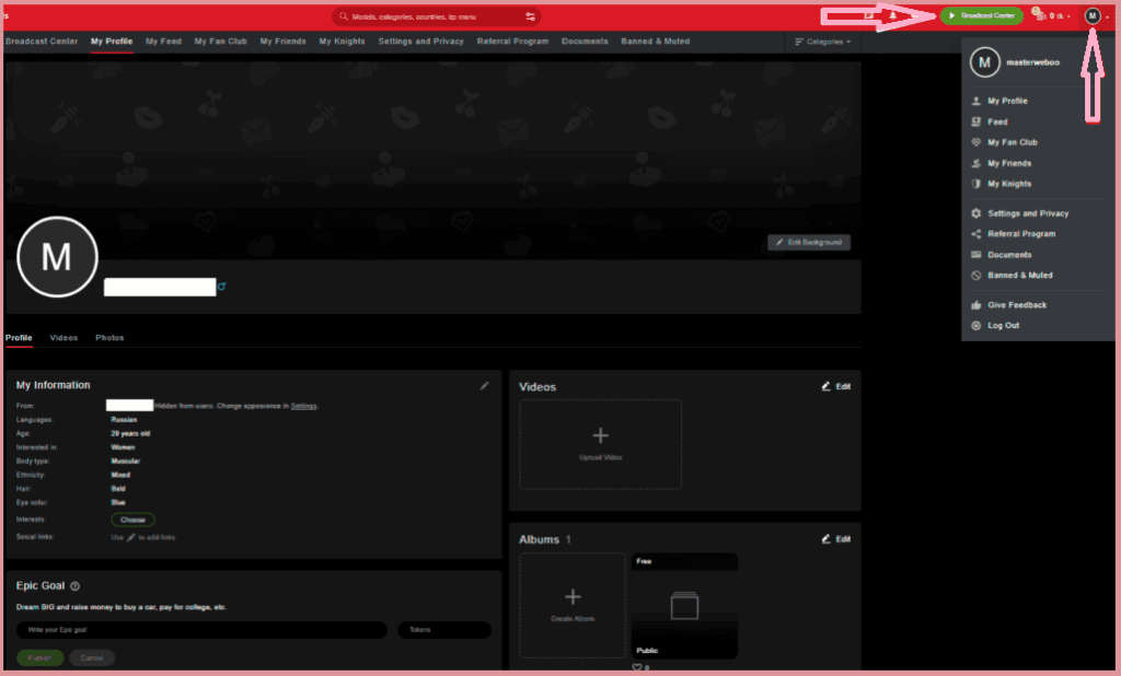 Models enter Stripchat by login and password, there should be no questions. In the personal cabinet, a personal page is set up. On it, you can add different panels, upload photos, videos. Something like a social network. There is a main menu at the top, and it is duplicated when you click on your login: