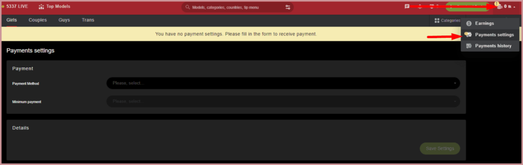 ePayments, Paxum, international bank transfers, SEPA, CosmoPayment, DirectPayments or check are available on Stripchat. The withdrawal method is selected in the payment settings: